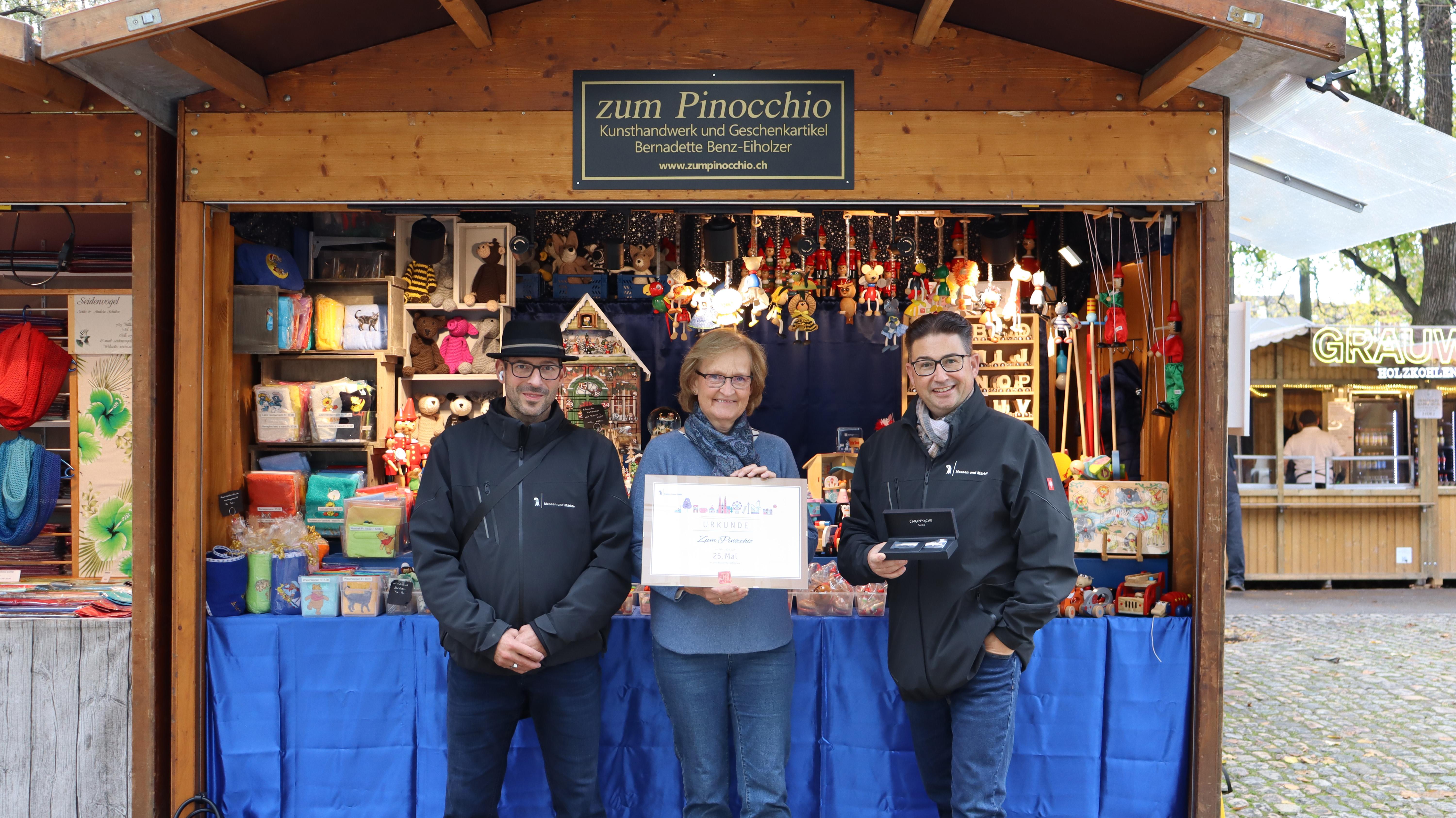 Zum Pinocchio verkauft Holzspielwaren und den legendären Pinocchio. Ergänzt wird das Angebot durch Musikspieluhren, Puzzles und handgemachte Frotteeartikel mit personalisierten Motiven, die als Geschenk besonders beliebt sind.